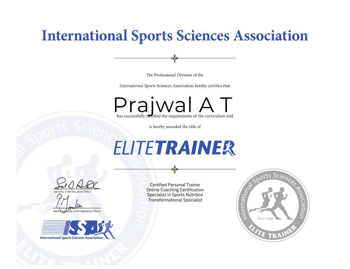 Hello, this is Prajwal, founder, director at GOGETFIT, your Coach. I am ISSA certified elite trainer. I am here to simplify fitness and make your fitness journey more fun, interesting and easy going. I create customized plans based on your preferences, budget, lifestyle, training level and goals. We together can make it possible. Enroll now. Let’s GOGETFIT.